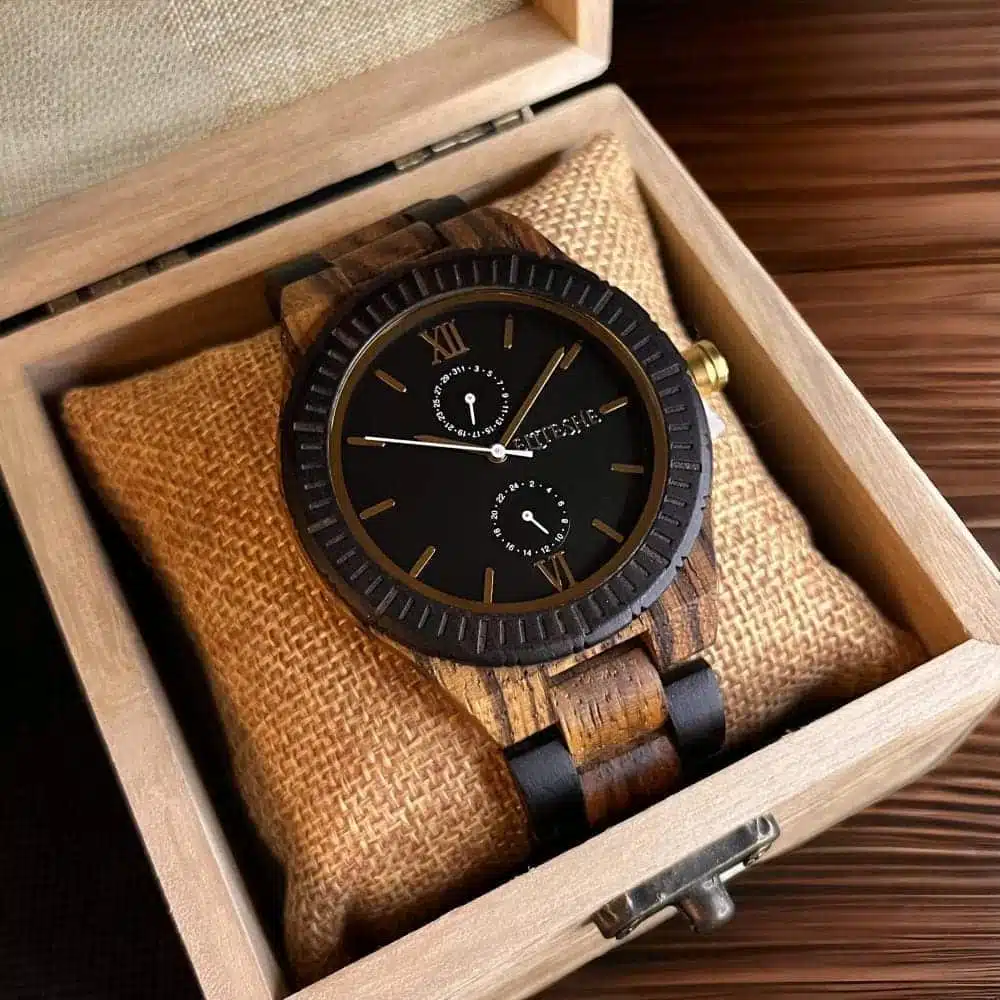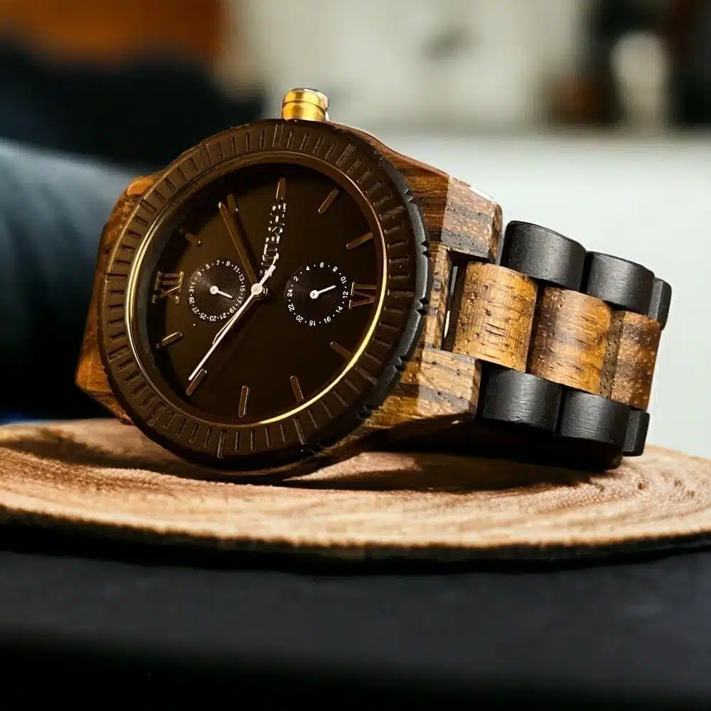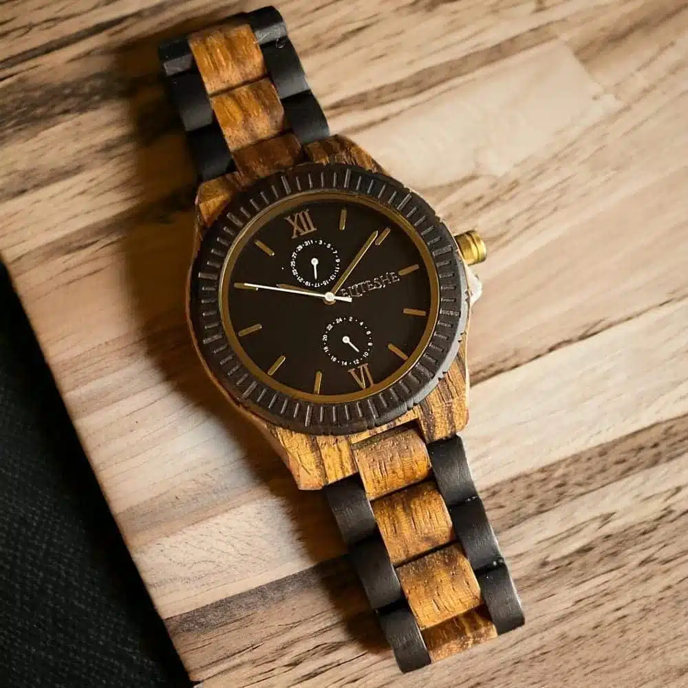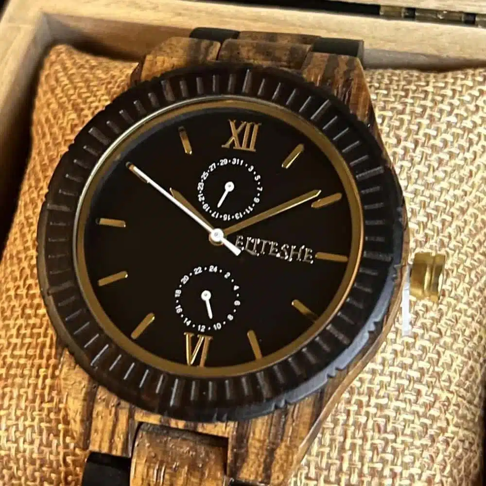 تعمل ساعة بلاك كلاسيك إيليجينت الخشبية بآلية حركة دقيقة وموثوقة، مما يضمن لك الوقت الصحيح في كل مرة. كما تتميز بمقاومتها للماء والخدش، مما يجعلها مثالية للاستخدام اليومي وتدوم لفترة طويلة.