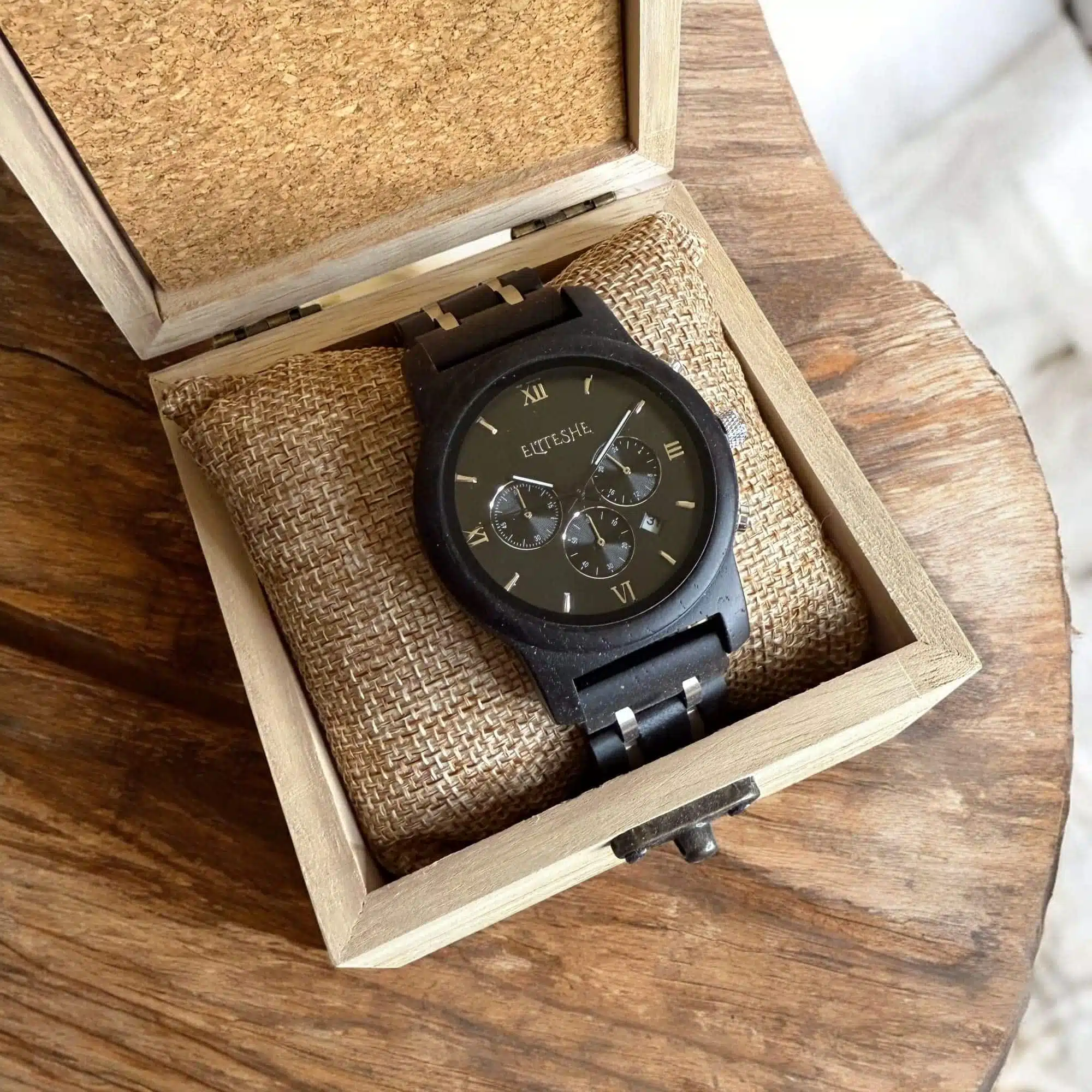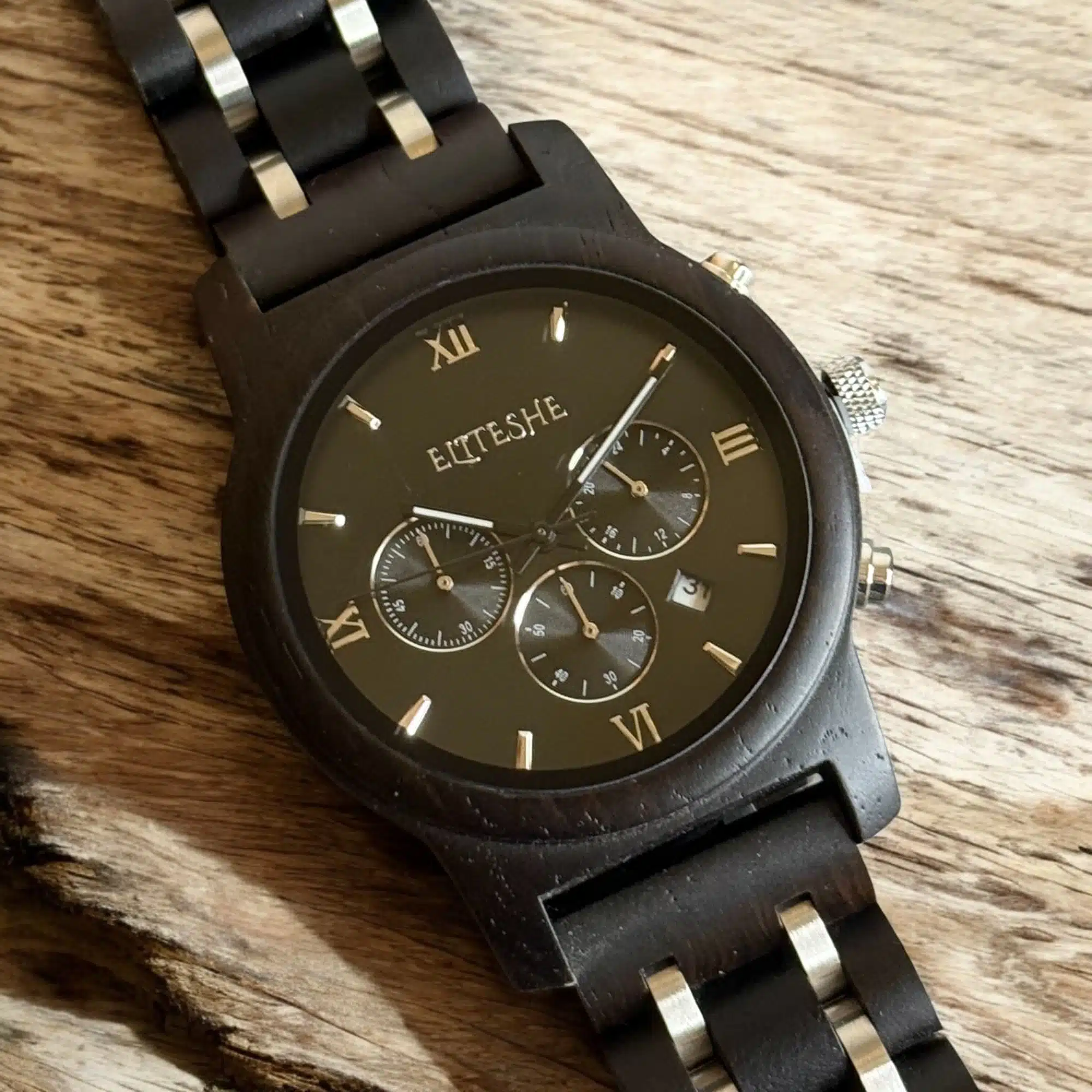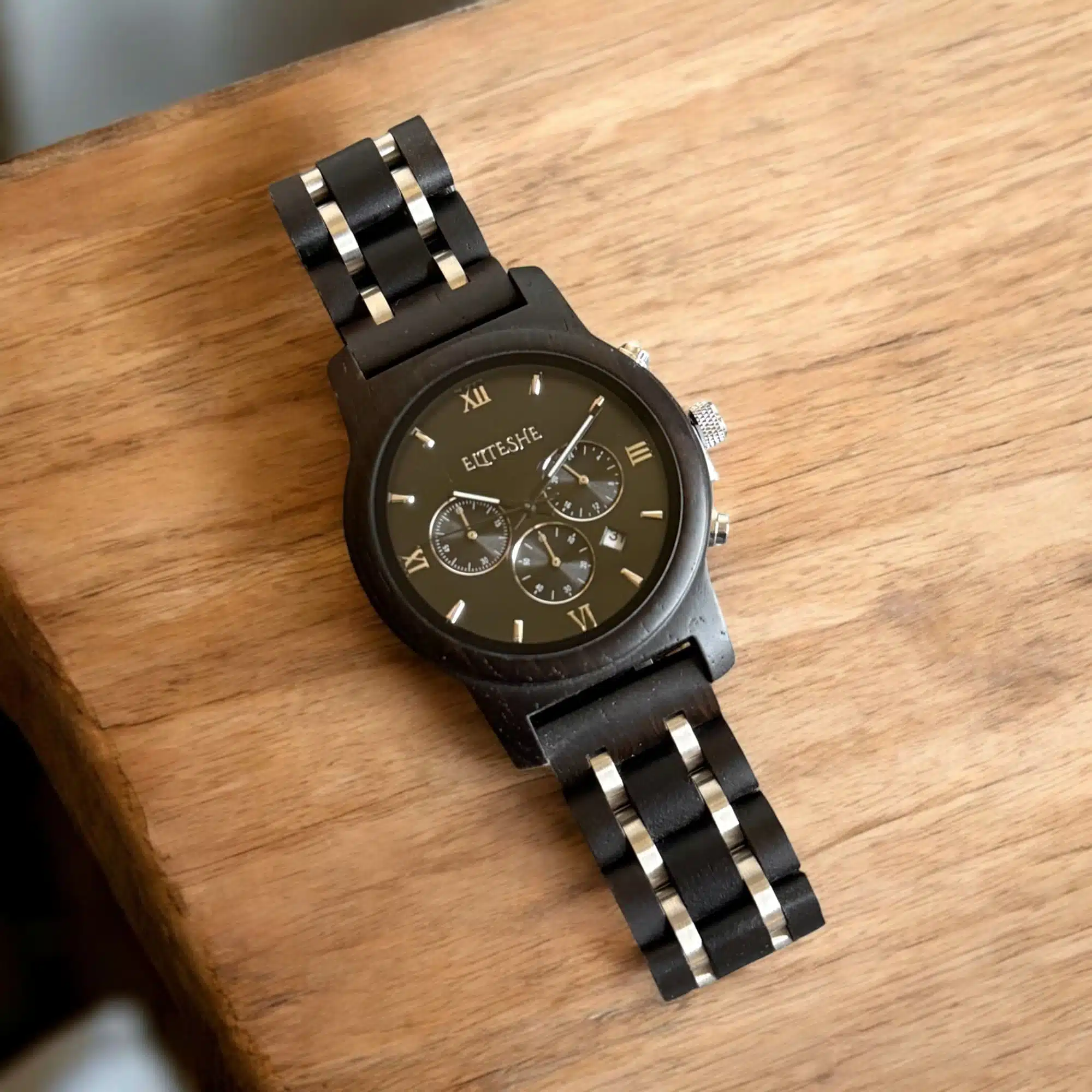 ⚫ Black Chrono Men’s Wooden Watch – Black Luxury with Precise Timing!