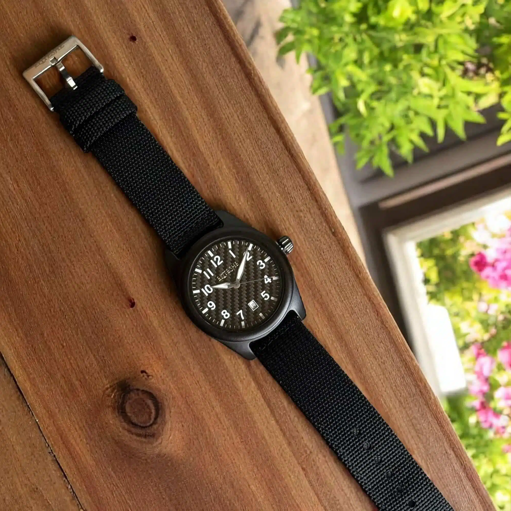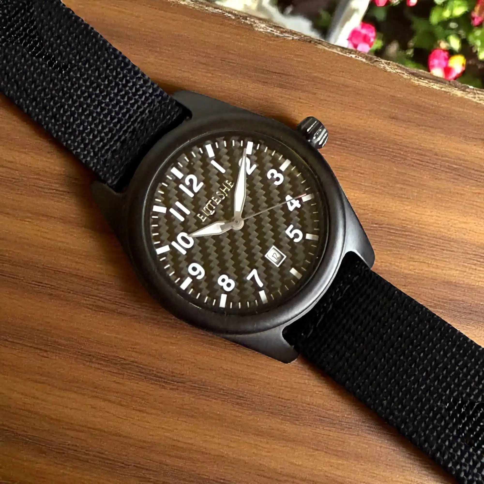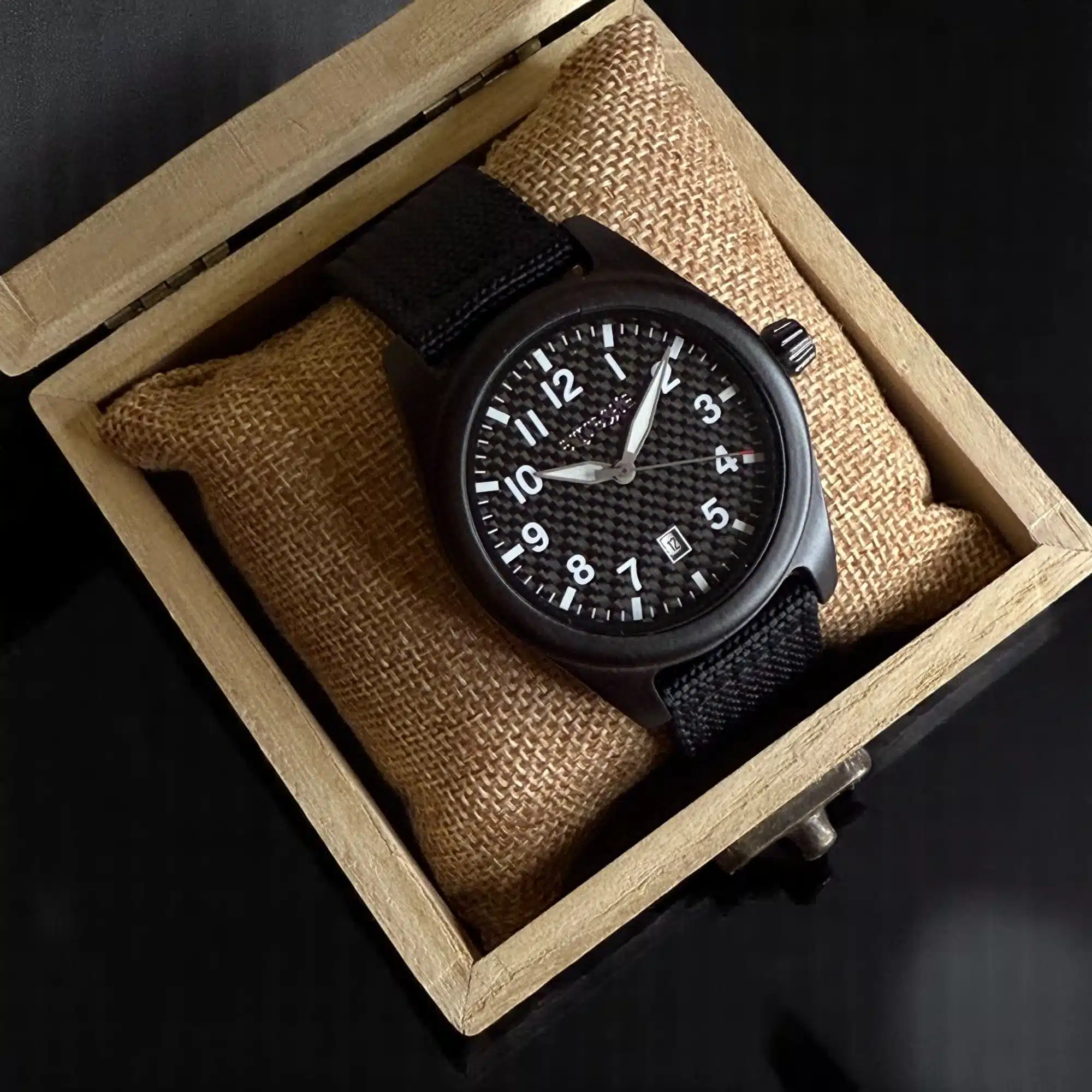 The Black Forest Icon men’s watch is a luxurious masterpiece in rare black ebony,combining the elegance of nature with modern carbon fiber technology. With a sleek 44mm design, a black carbon fiber face with elegant white numerals, and a dark black fabric strap – a distinctive choice for the man who appreciates absolute luxury.