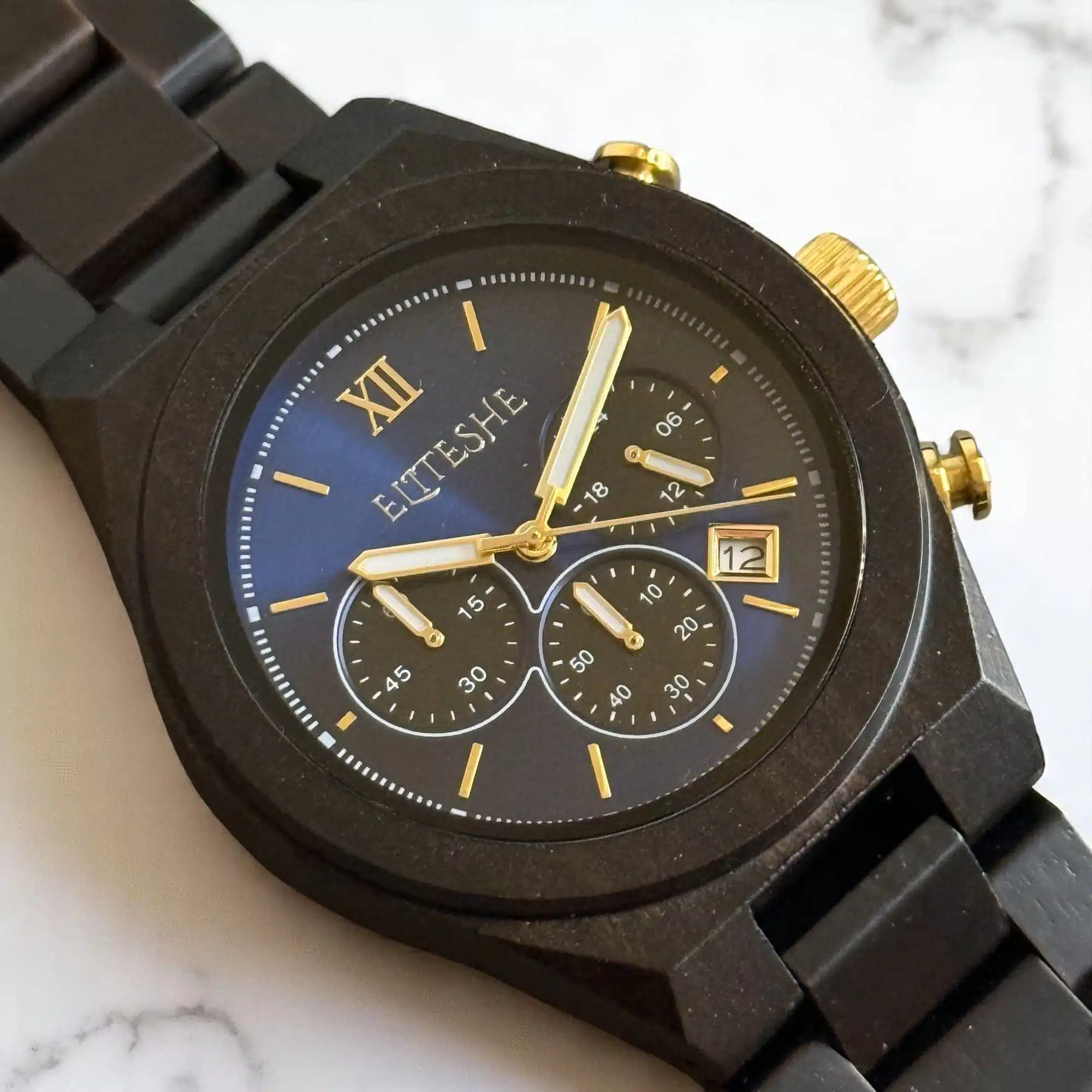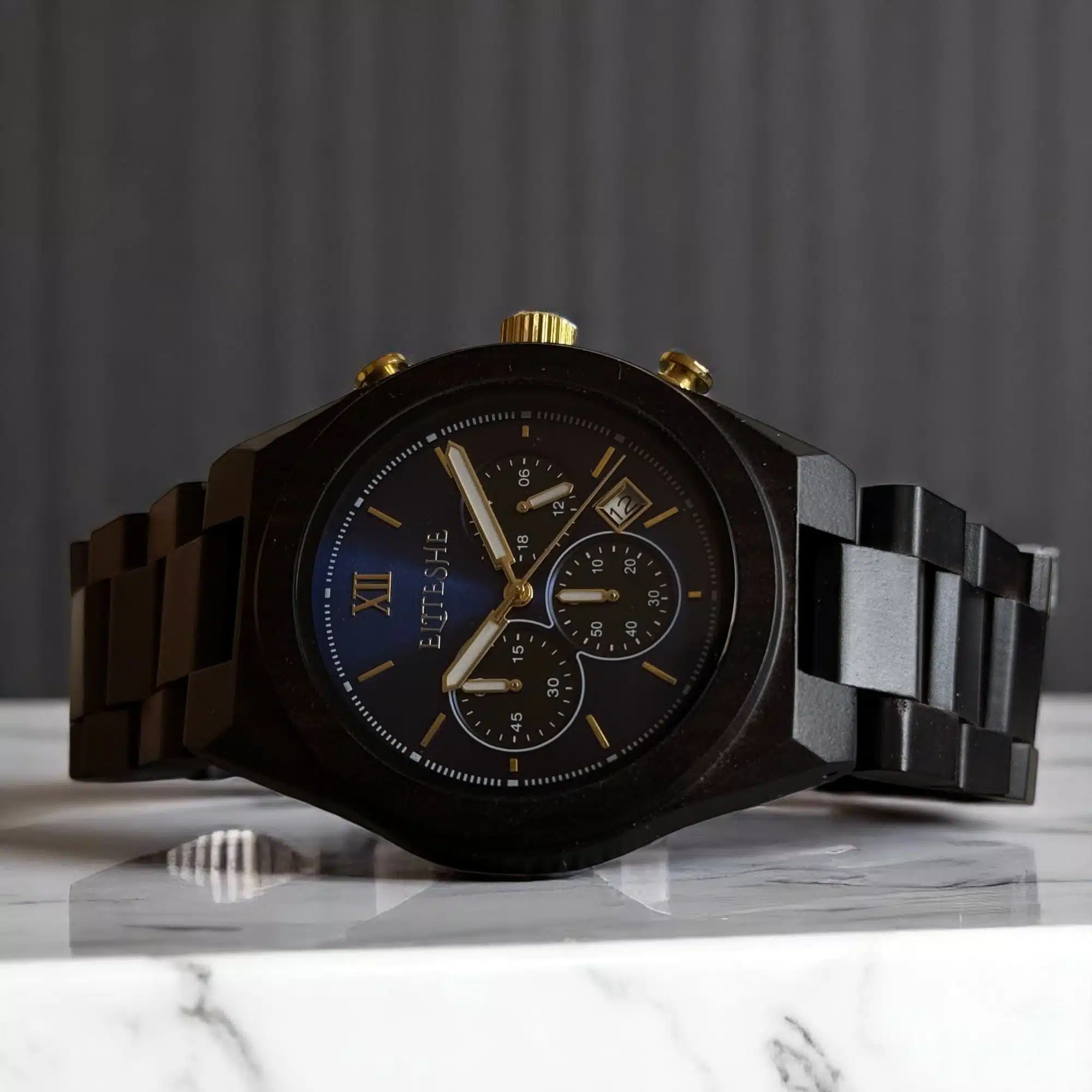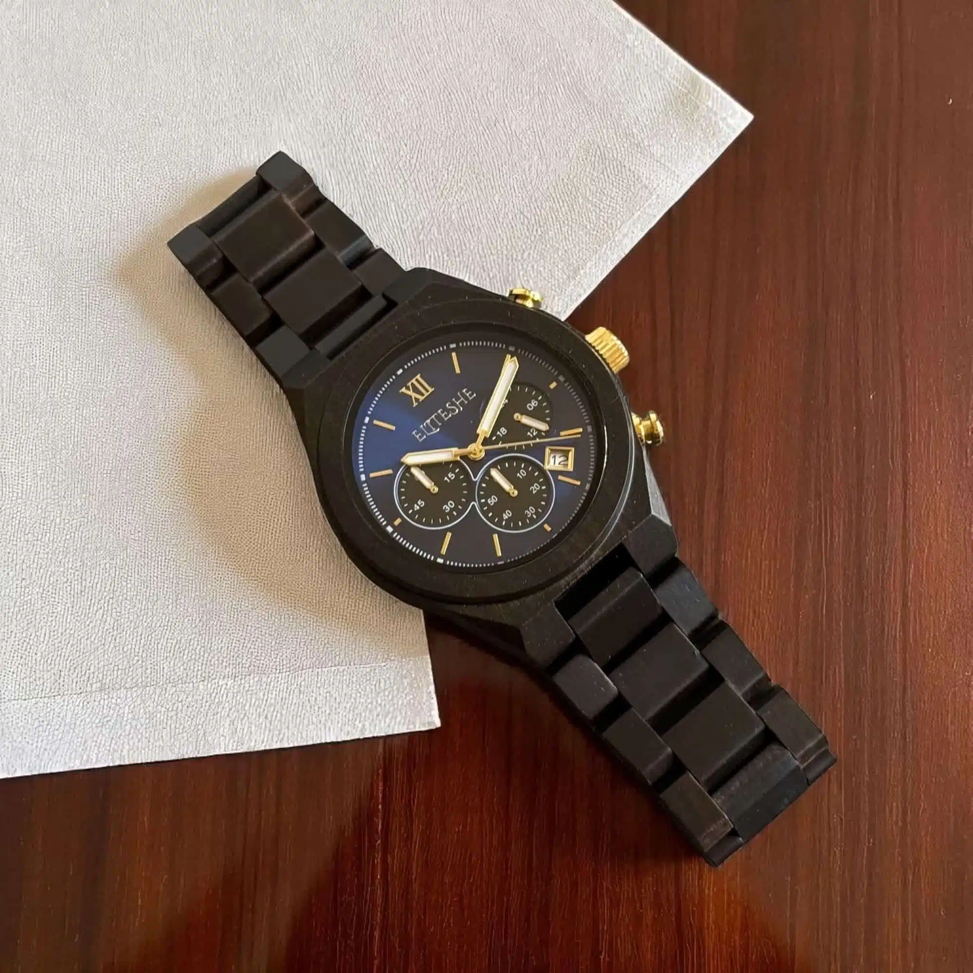 The Ebony Classic Bunnywood men’s Watch redefines luxury with its rare black ebony design . At 43mm in diameter and 12mm in thickness, it features a precision Japanese engine and scratch-resistant Hardlex glass, making it a luxurious masterpiece for the man who doesn’t compromise on style.