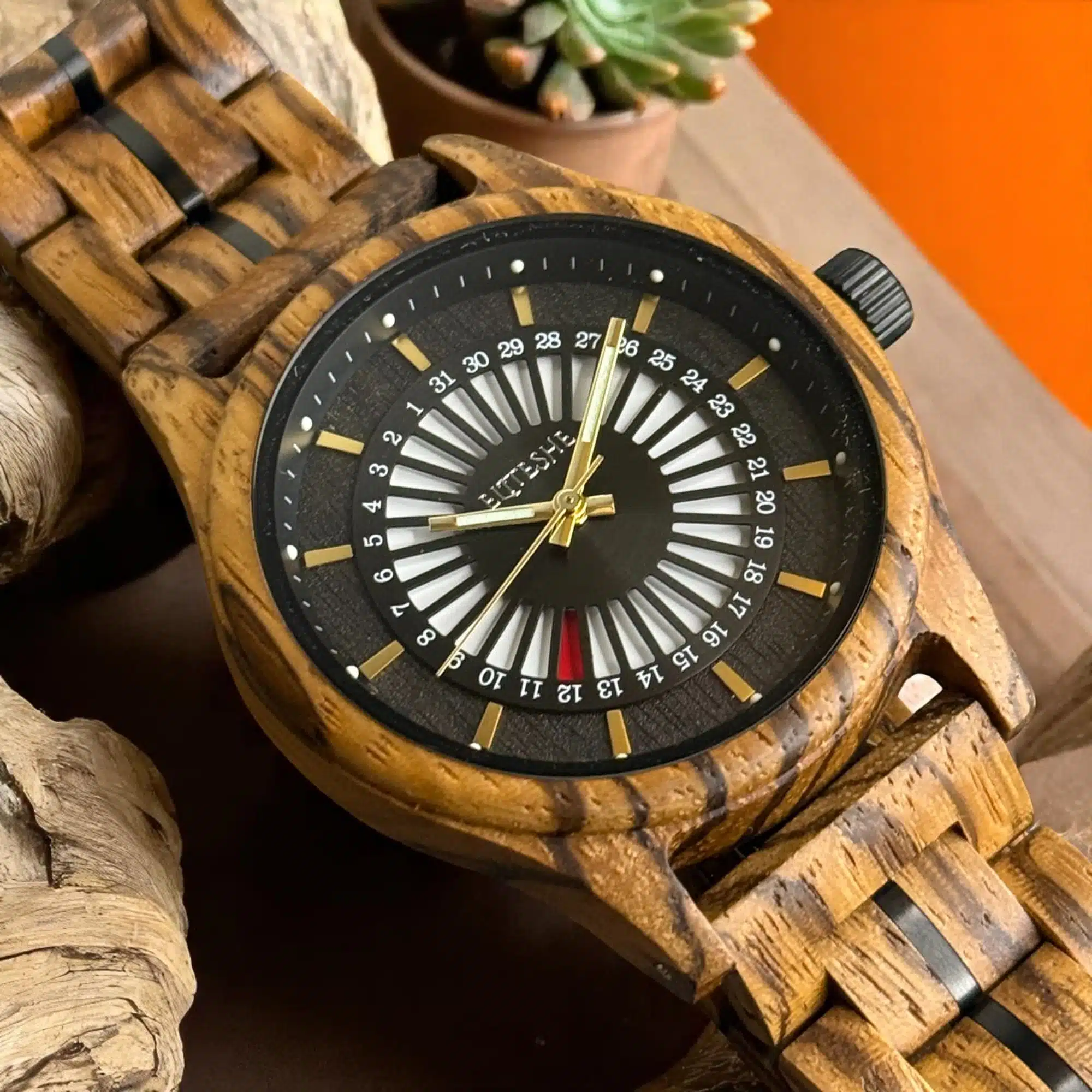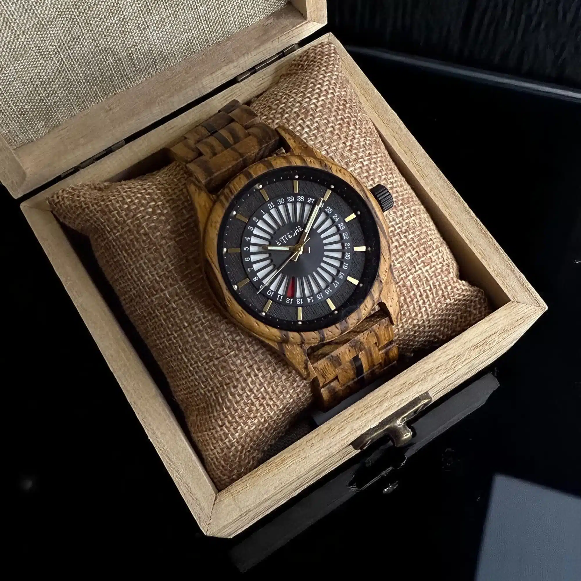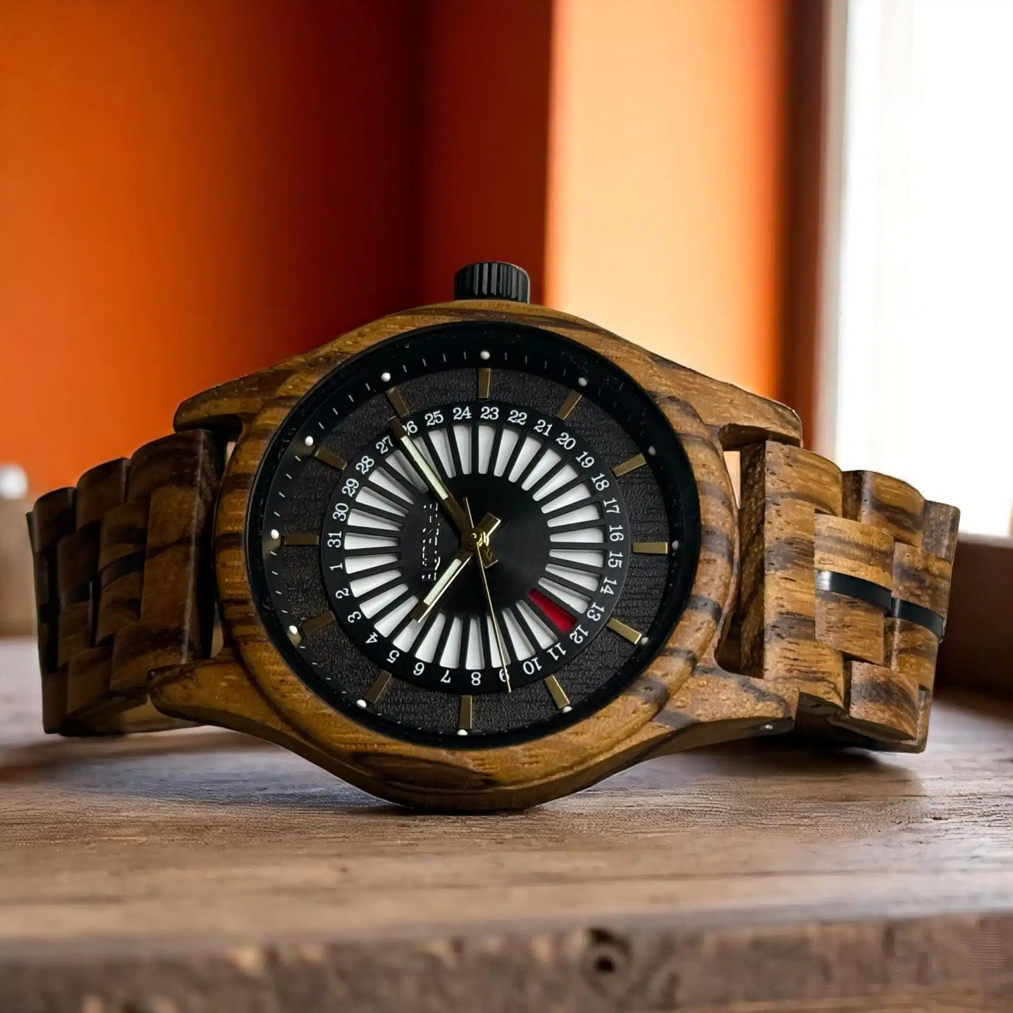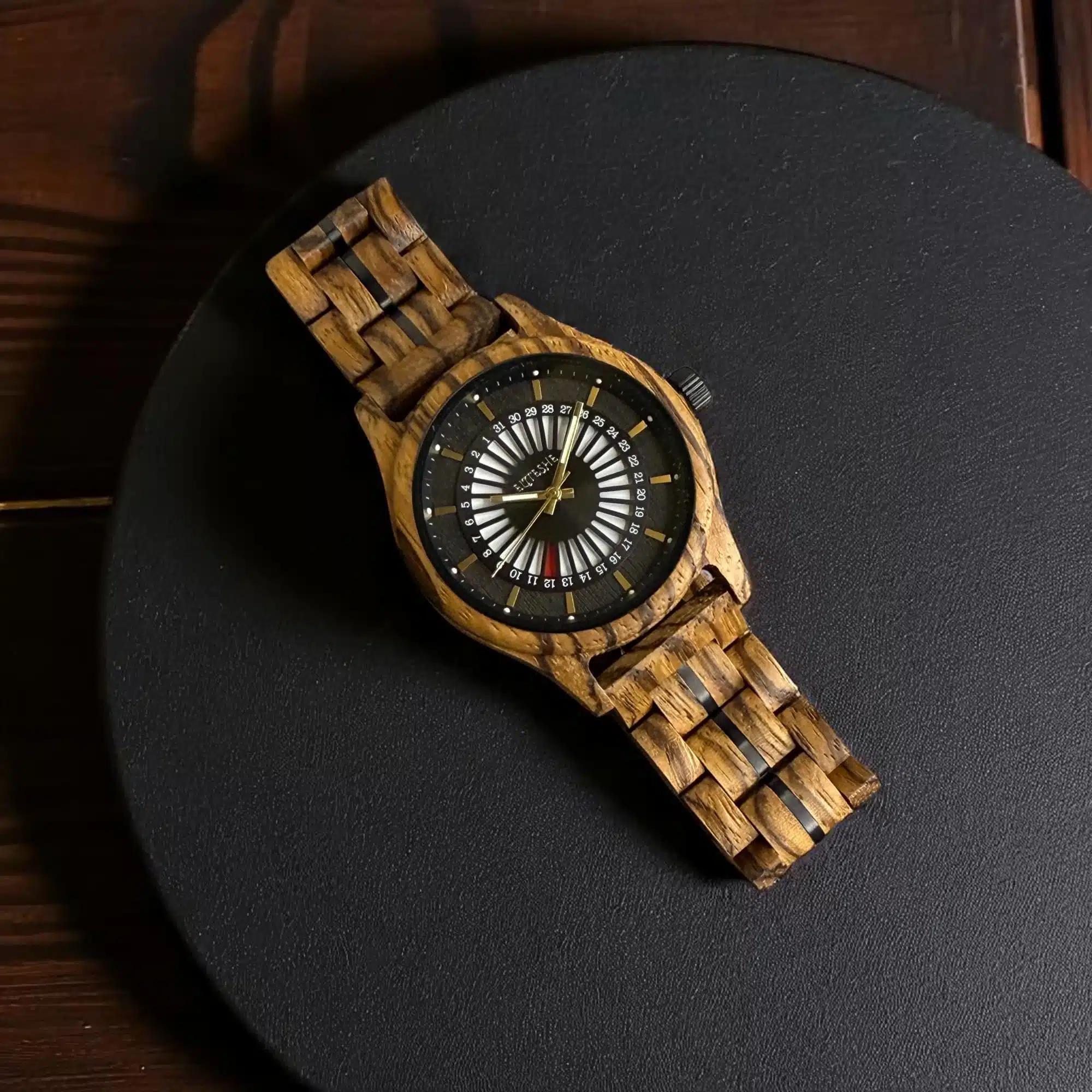 Watch The Light Roulette Wooden Roulette combines the elegance of fine natural woodwith a unique illuminated roulette design. With a 43mm diameter and 10mm thickness, it features a precision quartz motor, scratch-resistant Hardlex glass, and an elegant night light, making it the perfect choice for the modern man looking for a distinctive woodenWatch that turns heads day and night.