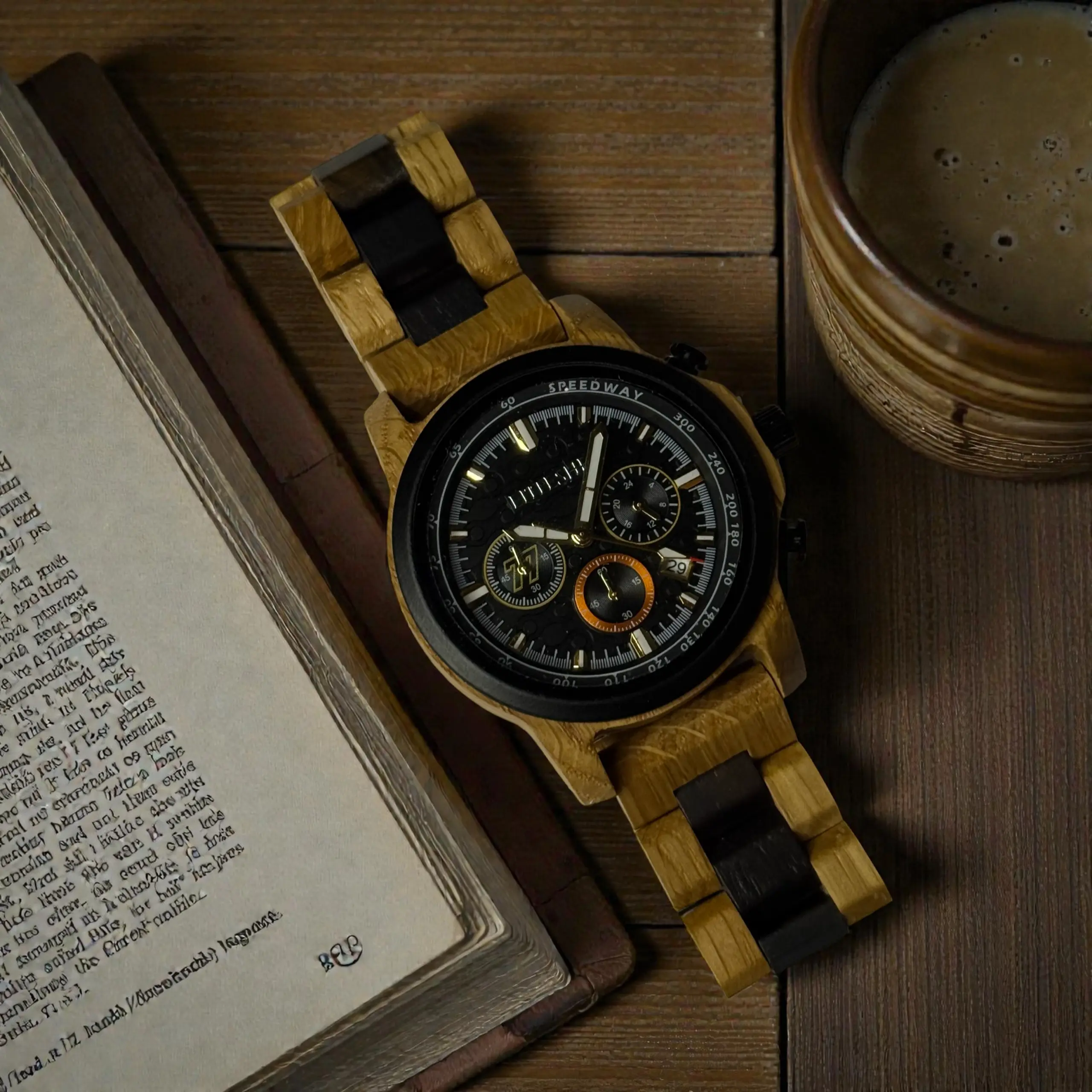 The Wood Olympic Men’s Watch is a unique masterpiece in fine natural wood,combining professional performance with natural elegance. It features an elegant 44mm round design with a 12mm thickness, with a classic black face,3 additional chronograph hands and a date box. An ideal choice for the man who appreciates precision and excellence in Wooden Watches.