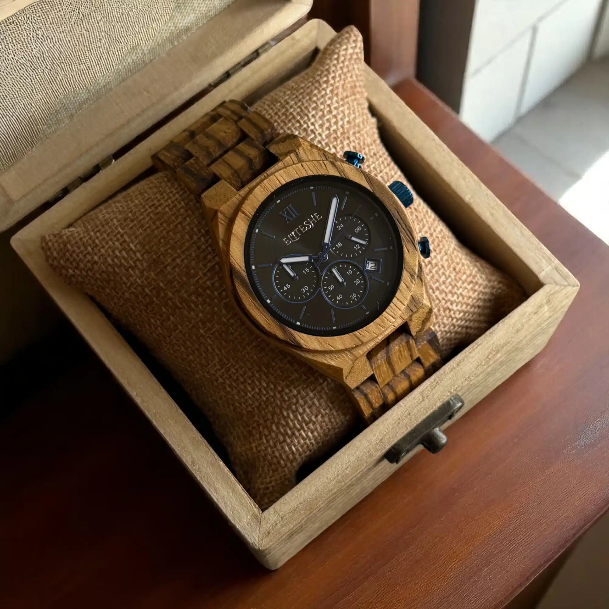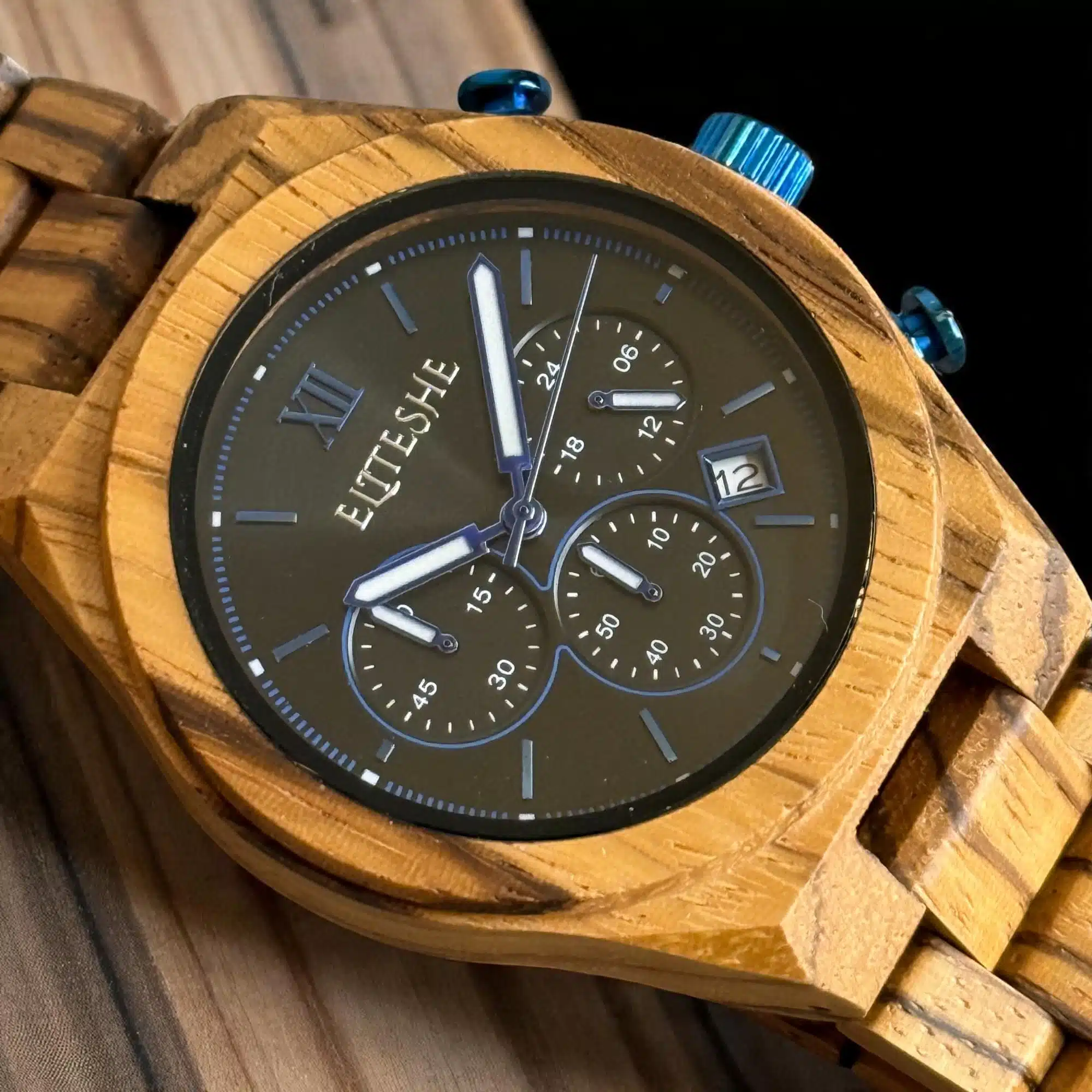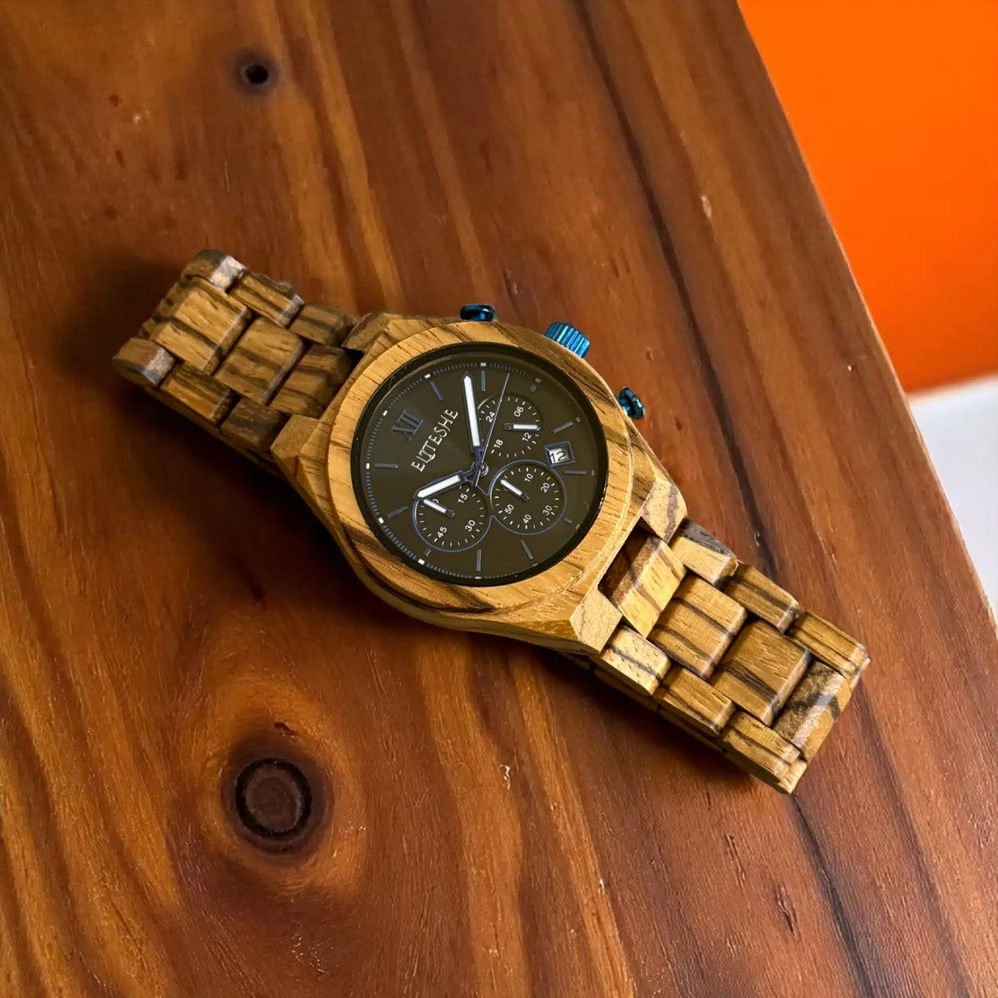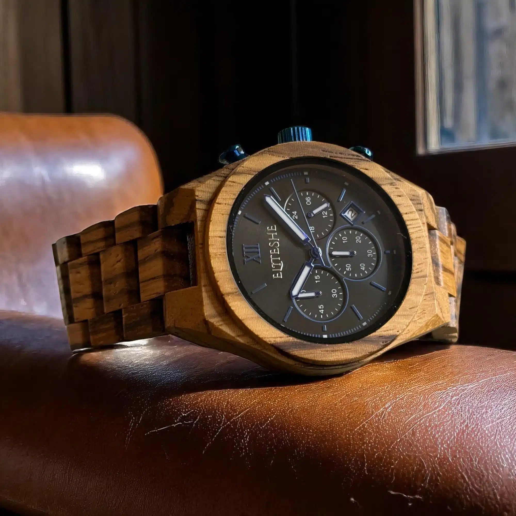 A polished wooden bezel adds to the watch’s durability and elegance.