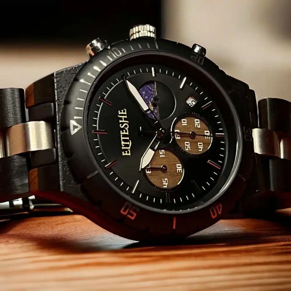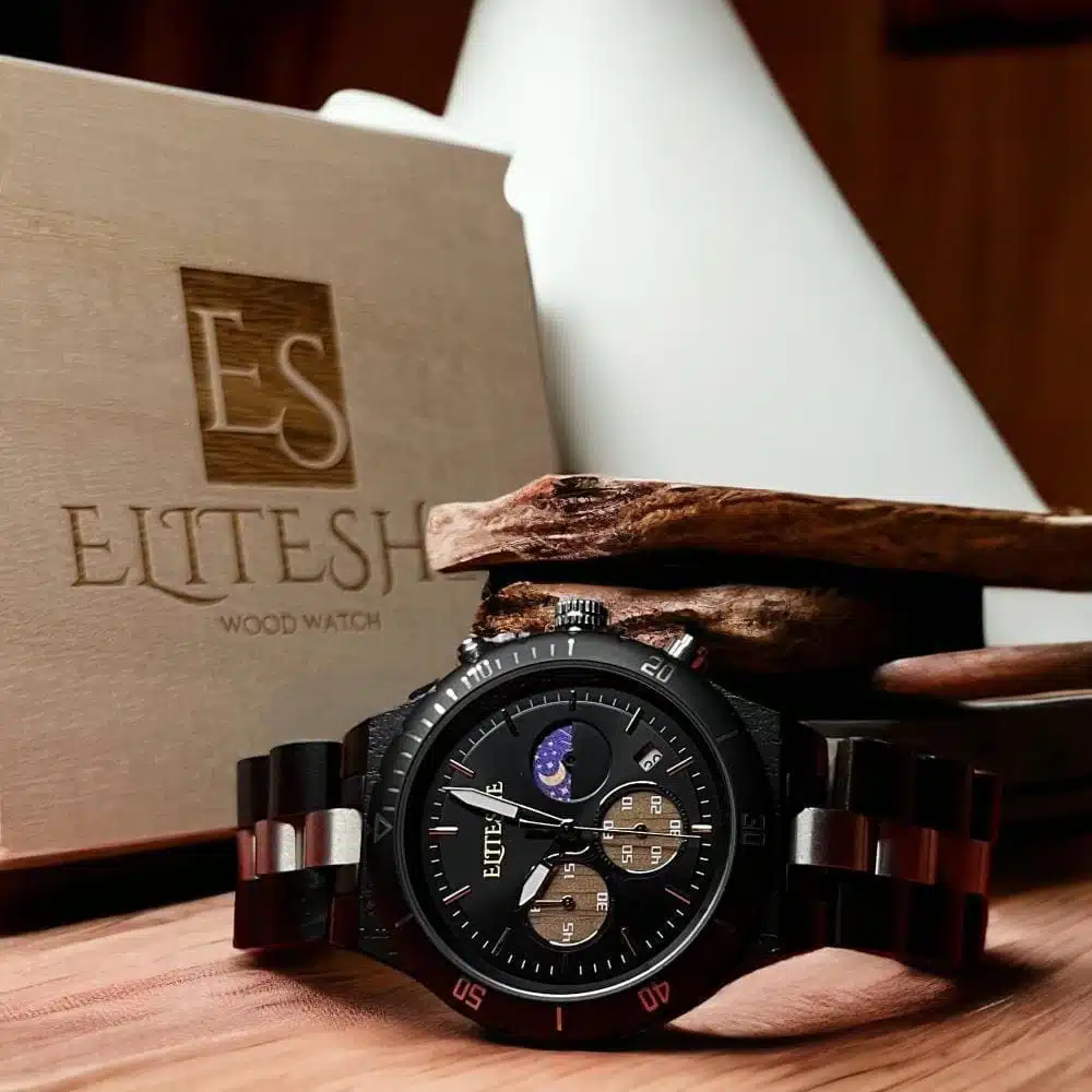 ⌛ ساعة بلاك ليجيند مون الخشبية – سحر الخشب الأسود الملكي بتقنية كرونوغراف فاخرة!