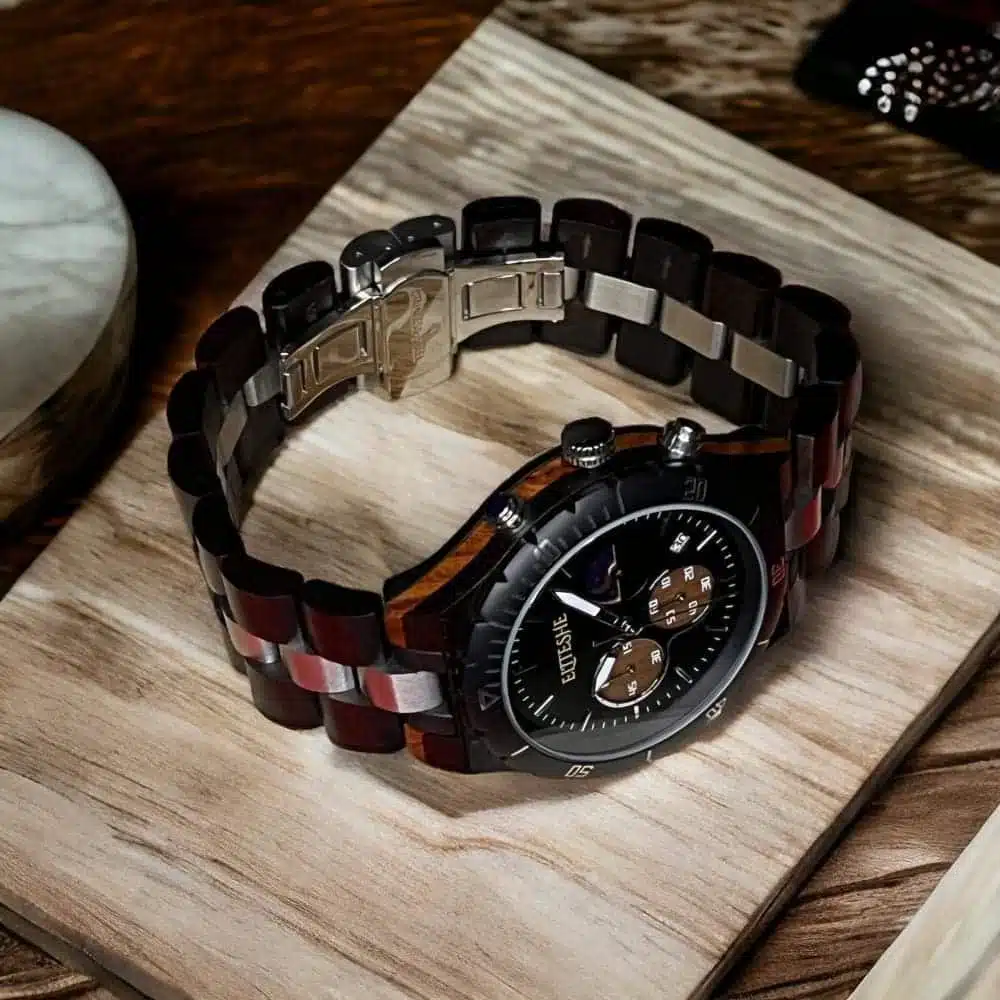 ساعة بلاك ليجيند مون الخشبية الرجالية هي تحفة خشبية تجمع بين أناقة الخشب الأسود الملكي وأداء الكرونوغراف الدقيق. مصنوعة بكاملها من خشب طبيعي بلون أسود جذاب، مع وجه ستيل أسود لامع يتوسطه مربع التاريخ وعقارب ليلية ونهارية.