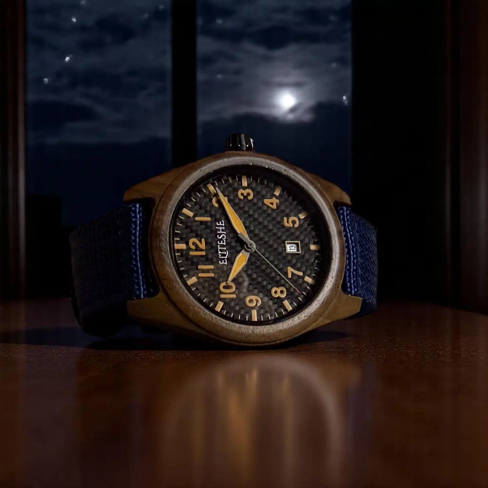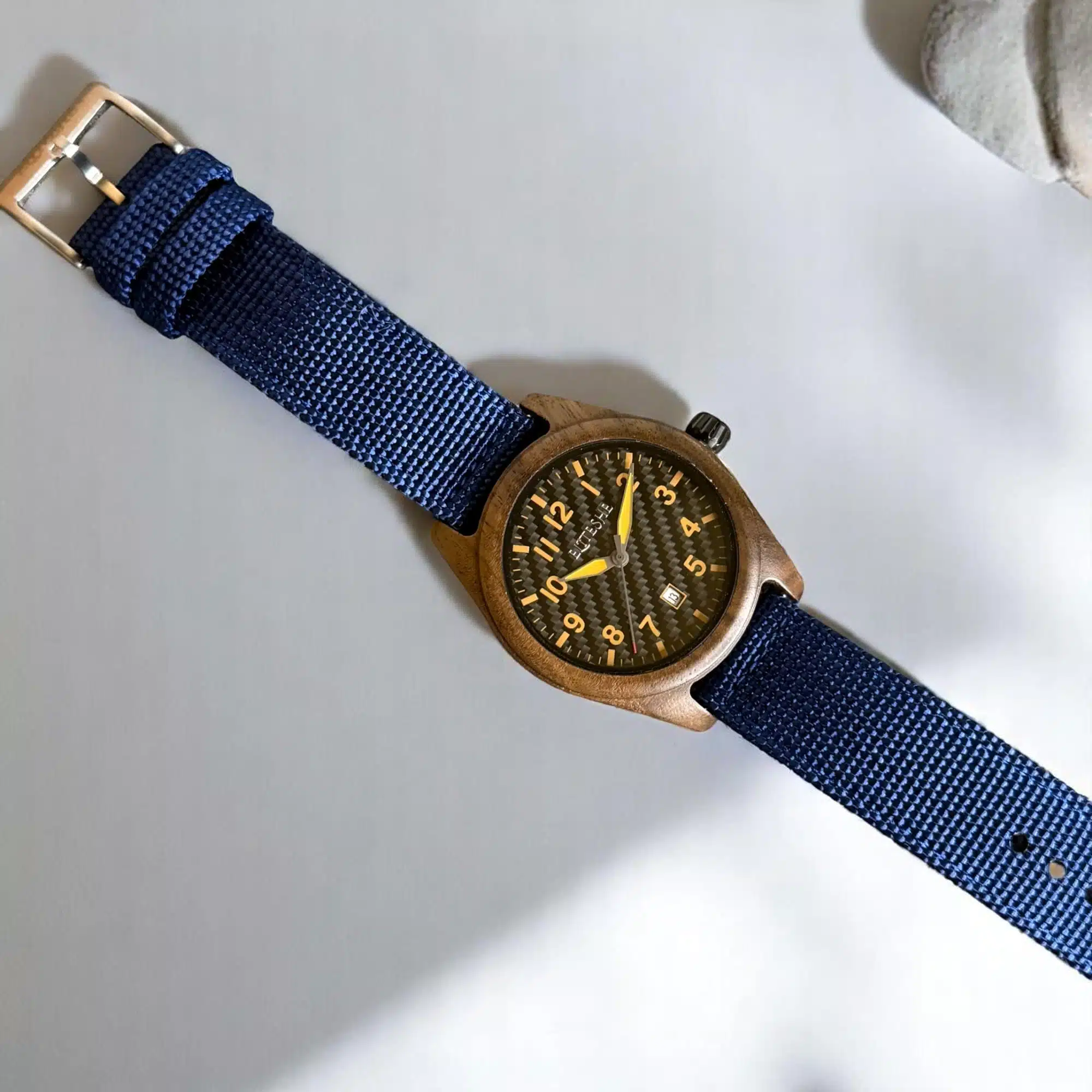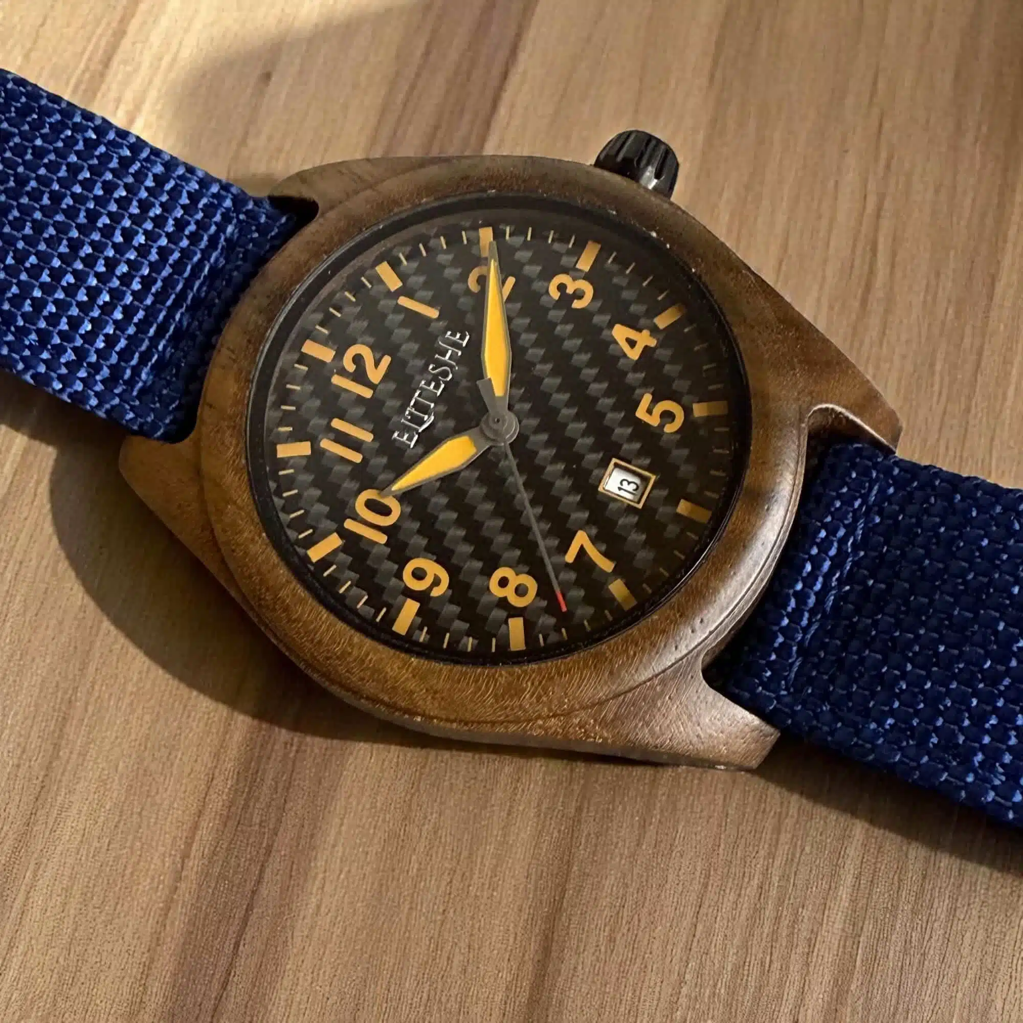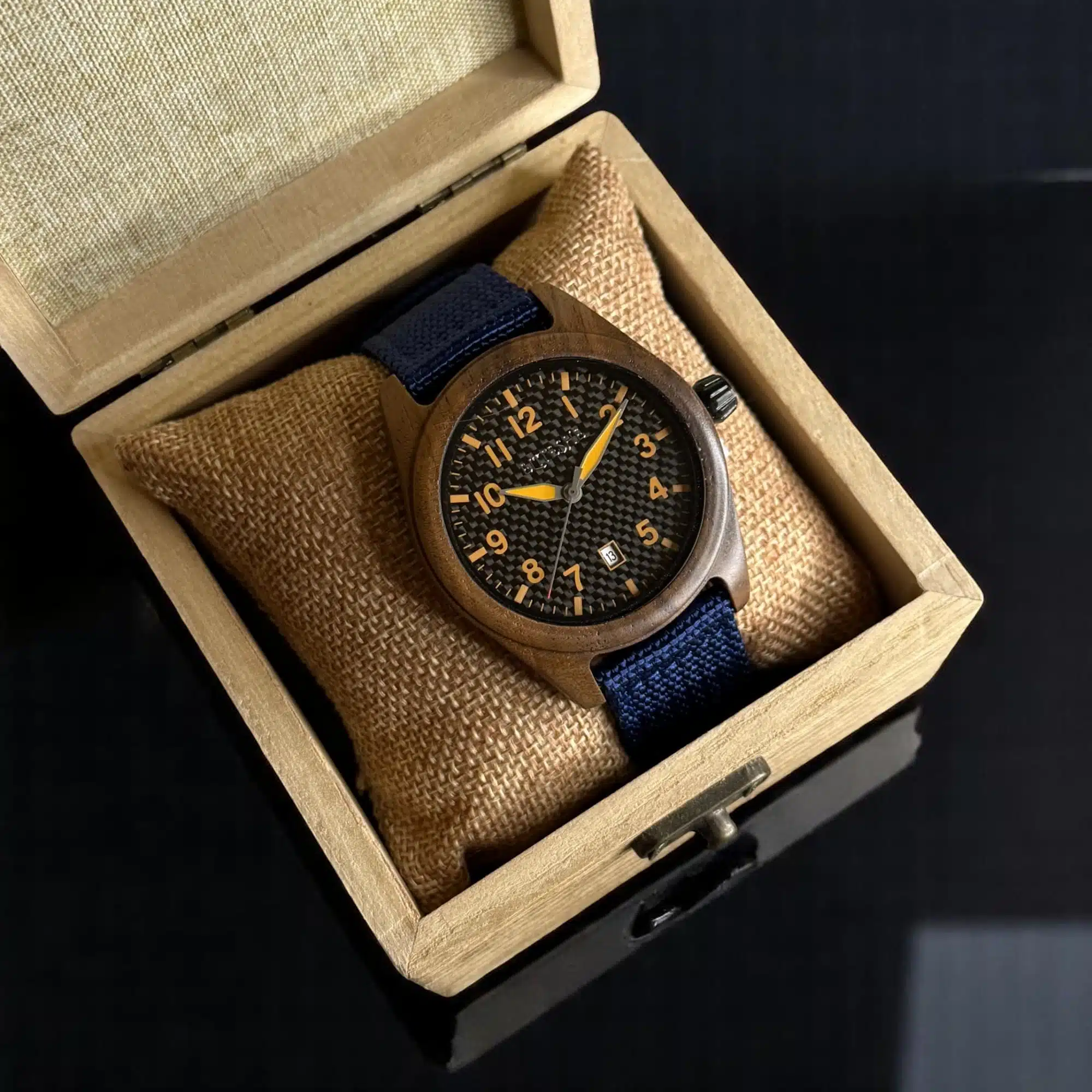 ساعة بلو فورست أيكون الرجالية تحفة فريدة تجمع بين دفء خشب الجوز الطبيعي وجرأة الألوان العصرية. بتصميم أنيق مقاس 44مم، وجه كربون فايبر أسود بأرقام برتقالية لامعة، وحزام قماشي أزرق غامق – اختيار مثالي للرجل الذي يجمع بين الأناقة والجرأة.