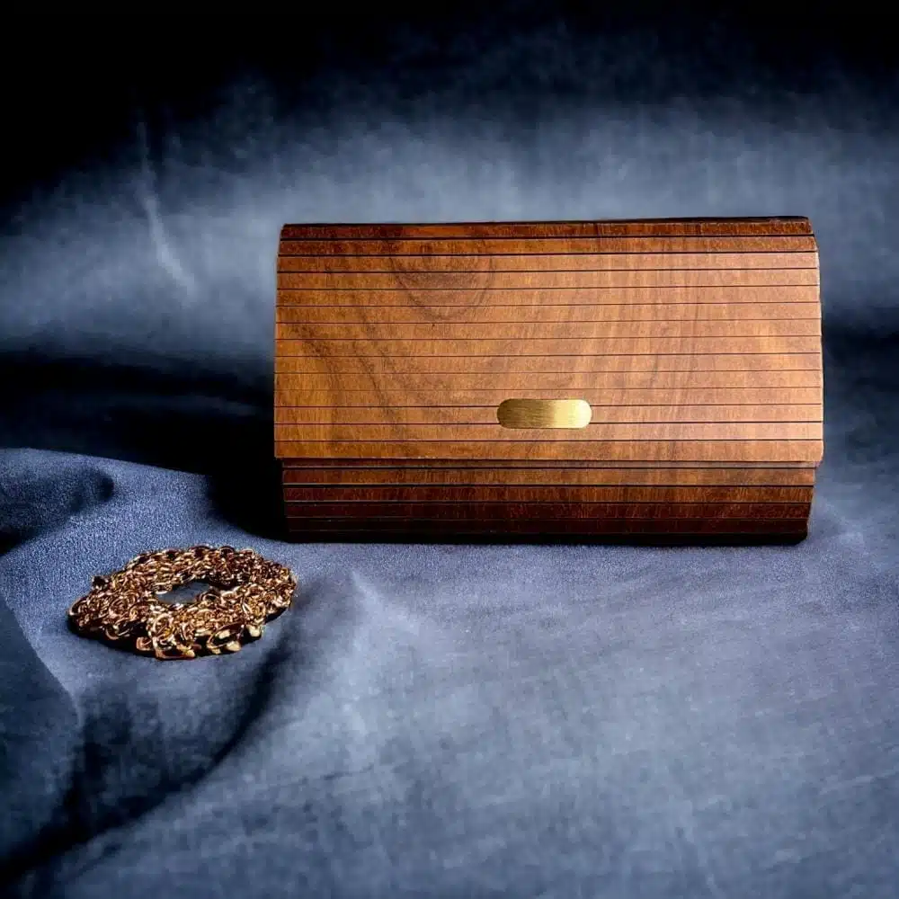 شنطة كلاسيك وود النسائية من إيليتشي، المصنوعة من الخشب الطبيعي والمبطنة بالجلد من الداخل، تجسد الأناقة والأصالة في تصميم كلاسيكي مميز.