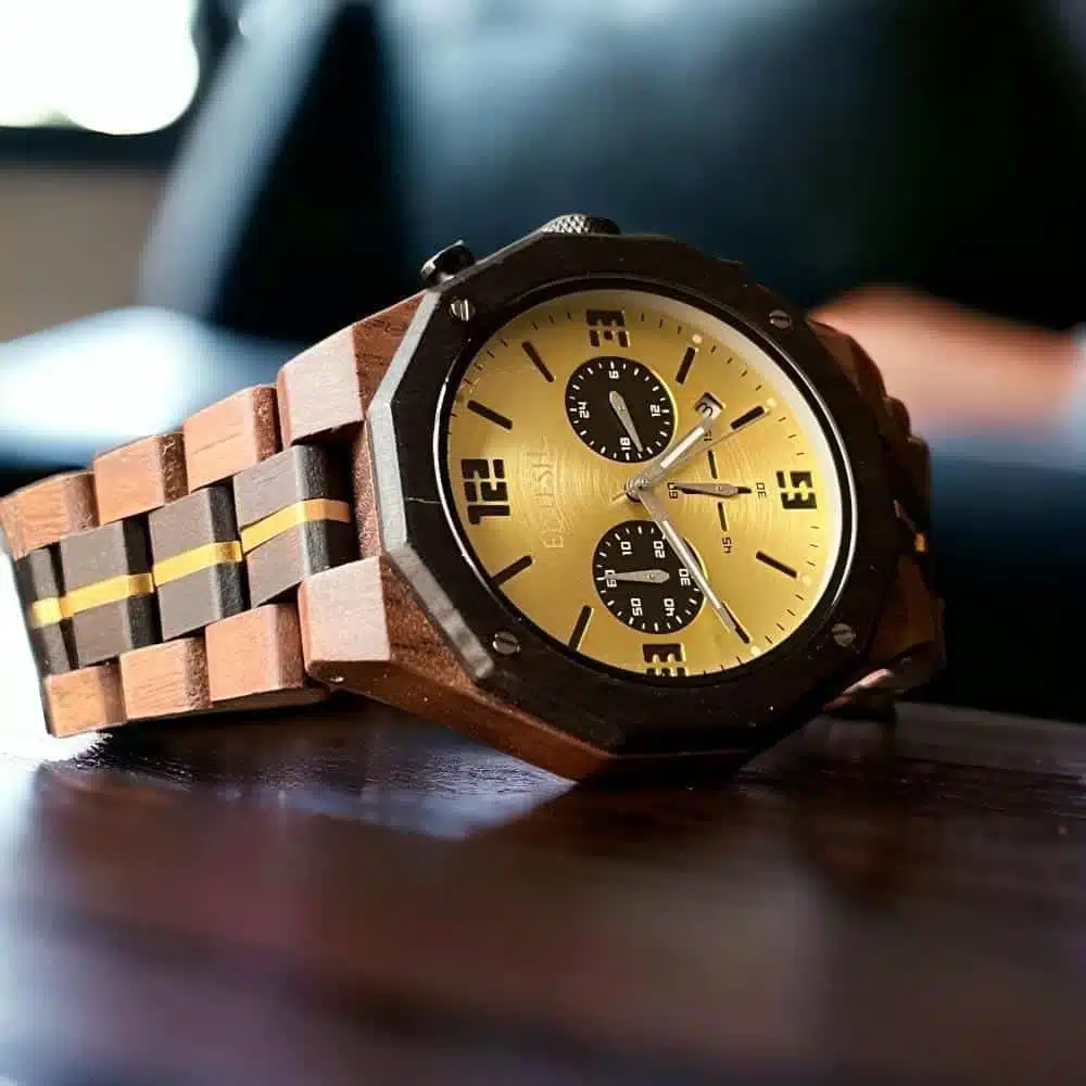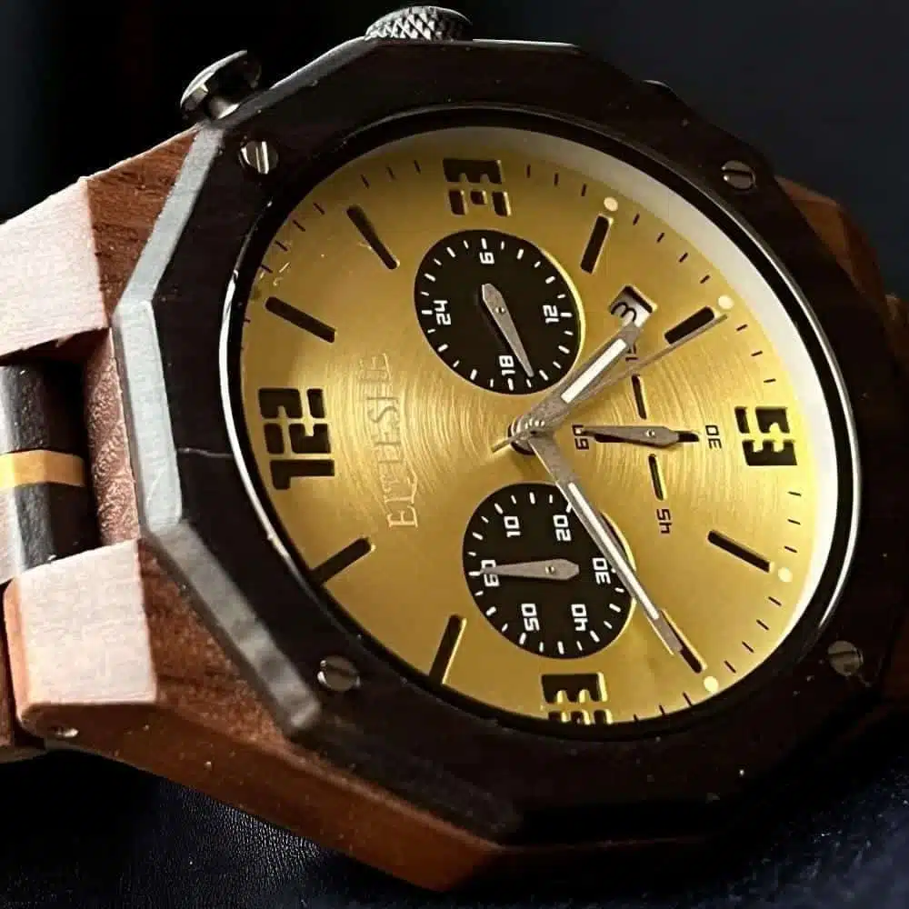 ساعة قولدن لوكشيروس الخشبية تتميز هذه الساعة بمحرك كوارتز ياباني الصنع فاخر وانيق مع خاصية التاريخ وتأتي بتصميم مضلع عصري وتاتي بزجاج الزجاج ياقوتي المقاوم للخدش وحزام الساعة الخشبي بالكامل . هذه الساعة مصنوعة يدويًا بدقة متناهية من خشب الزيبرا والأبانوس الطبيعي الإستوائي .
